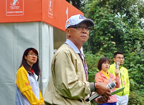 【golftime讯】平安银行中国美巡赛·重庆·江南新城·庆隆公开赛,10月17日在清晨小雨和轻雾中按时开球,在一号洞担当中英双语出发员的是球场总经理陈俭良先生。为了这个赛事夜以继日工作了几个月的陈总,在发球台上终于有时间可以跟多年来认识的中国选手致意和为他们唱名出发。 (摄影/报道:golftime·青山绿水)