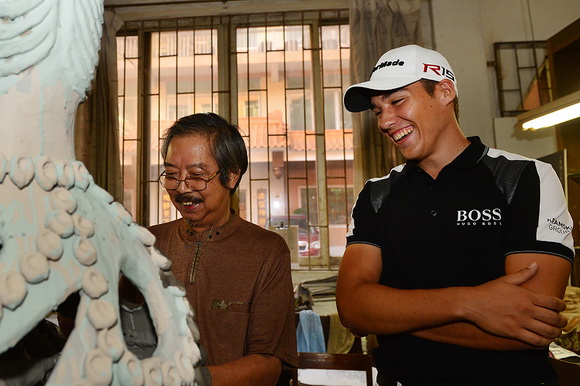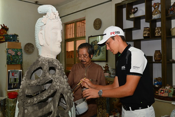 【golftime讯】10月20日,组委会安排了18岁的德国球员多米尼克·福斯(Dominic foos)前往佛山石湾美术陶瓷厂,在参观闻名遐迩的佛山陶瓷的同时,也跟随国家级陶瓷艺术大师、佛山公开赛奖杯的设计者梅文鼎学习制陶工艺。
