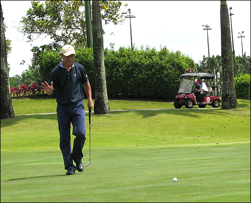 16日的8对8个人对抗赛打得紧张激烈。新加坡队的小球手们,对前两场比赛的平局显然有些不服气。个人对抗赛展开后,“小老虎”们个个奋勇,洞洞争先,向北京队的前辈发起了猛烈进攻。北京队的老将也克服疲劳,抖擞精神迎战。但体能的欠缺显然是中方落败的主要原因,“太累了”、真受不了了”这些词,挂在几乎所有队员的嘴边。打到第16洞时,北京队只剩王福生、范越两人未败。但打到第18洞时,就只有范越一人在孤军奋战了。最终这场8对8个人对抗,北京队只有范越战平对手赢下0.5分,而新队狂卷7.5分。由于前两战双方战平,比分为2比2 ,所以最终双方的总比分为11.5比4.5。新加坡队的小队员们为胜利欢呼,击掌庆贺。但北京队的老将们并不因失败而沮丧,他们纷纷表示此行收获甚丰。