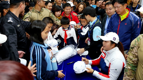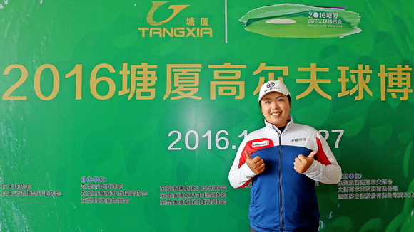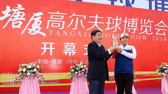 【golftime讯】 2016(第八届)塘厦高尔夫球博览会(下称高博会)24日在东莞市塘厦镇塘龙广场盛大开幕,2016年里约奥运会上为中国夺得唯一一枚高尔夫奖牌的广东女子高尔夫球员冯珊珊在紧张的比赛之余,莅临开幕式现场,为高博会助力。
