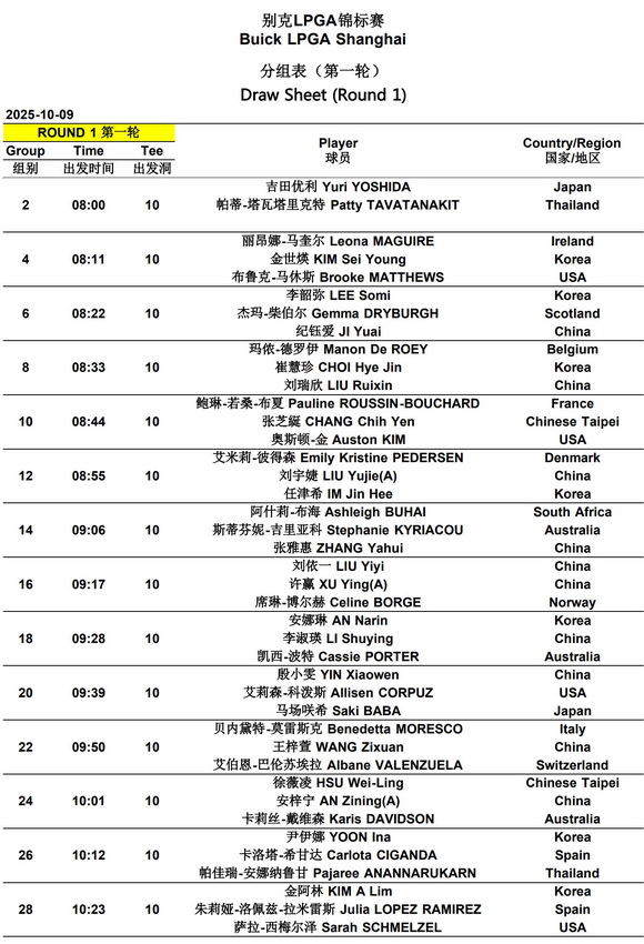 【golftime讯】2025别克LPGA锦标赛10月6-12日在上海旗忠高尔夫球会举行。本届赛事不设淘汰线,共有来自全球高尔夫82名女子顶流选手完整进行9-12日四轮比赛。以下为10月9日周四首轮分组表: