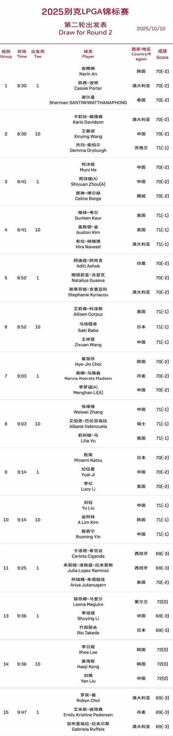 2025别克LPGA锦标赛第三轮分组表 按前两轮...(10月10日)