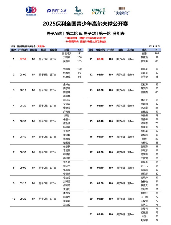 【golftime讯】11月30日,2025保利全国青少年高尔夫球公开赛AB组首轮比赛,在重庆保利球场晨雾与朝阳中开杆。经过一天的技巧、体力、意志综合比拼,男子A组李政达开局火热全程领先;刘泽宇三杆优势领跑男子B组;女子A组霍旭冉发挥稳定占据头名;女子B组黄金果和蔡慧珍携手位列榜首。