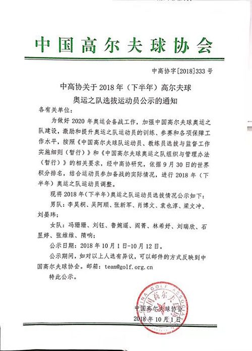 关于2018年(下半年)高尔夫球奥运之队选拔运动员公示的通知