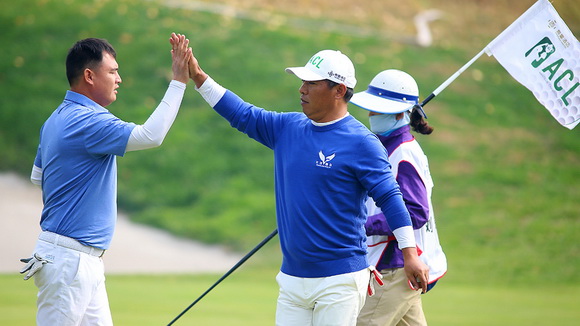梅青林和老搭档杨乐交出68杆(-4)。