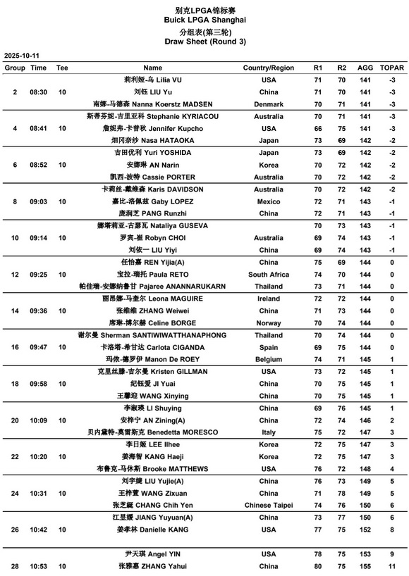 2025别克LPGA锦标赛第三轮分组表 按前三两轮...(10月11日)