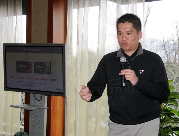 高仕利公司大中华区品牌经理Mack KAO,向媒体朋友介绍Titleist高球优选系统。