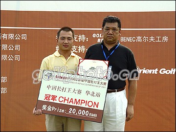 Golfweek杯2005年首届中国长打王大赛华北站冠军程海宝(左)接受颁奖。冠军程海宝,年仅21岁,他此次以326y夺冠,并获得2万人民币的奖金。 |