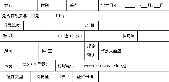 ●必须填写报名表所有资料并请仔细阅读竞赛日程及下列各事项: 1、我保证以上提供的资料真实有效,根据中国高尔夫球协会的有关规定,我的身份是业余球员。赛事主办单位保留权力,在必要时,要求球员出具相关证明材料。 2、我特此申明,对于在本次比赛和训练过程中出现的任何可能的人身事故和财产损失,赛事主办单位及其承办机构不承担任何责任。赛事主办单位有权使用有关此比赛和训练中我的肖像权。 3、球员报名后有义务致电中信朝向查询报名情况及接受主办安排的新闻采访。 4、报名表经赛事组委会审核无误,从接受报名之日起自动生效。 5、所有选手须参加7月1日晚举行的欢迎晚宴。 6、报名截止日期:2007年6月25日17:30。 8、请将此表格传真至:中信朝向高尔夫管理有限公司;