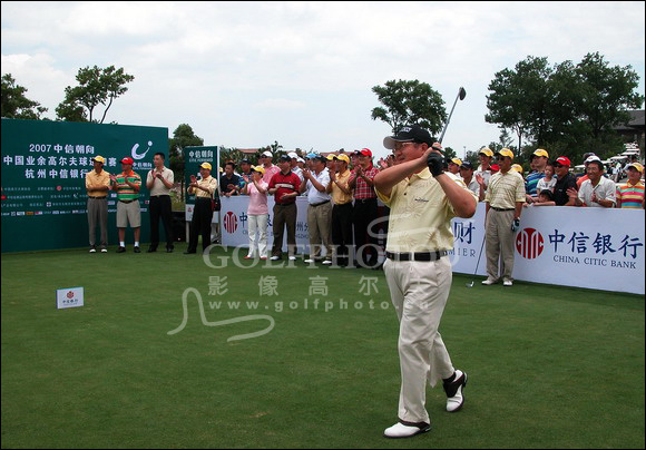 【golftime讯】2007年7月1日,中信朝向中国业余高尔夫球巡回赛本年度第四站比赛——杭州中信银行站的嘉宾、球员配对赛,在绍兴鉴湖高尔夫球会举行。中国高尔夫球协会副主席、中国职业高尔夫球员协会主席、中信朝向高尔夫管理有限公司董事长王军先生出席开球仪式,并为赛事开出彩球。浙江省高尔夫球协会名誉主席张蔚文先生等领导嘉宾也出席了开球仪式。
