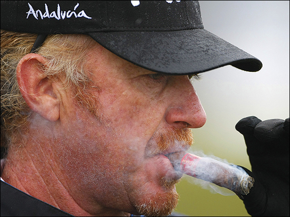 【golftime讯】第136届英国公开赛将于当地时间7月19日在Carnoustie拉开战幕,目前选手们都在紧张的练习,为比赛做最后的准备。英国公开赛有可能会在雨中进行,天气预报说最近的潮湿天气会在周四和周五减弱,但周末的时候还会回来。不管是否下雨,西班牙选手吉姆南兹都一如既往的拿着他的雪茄烟。