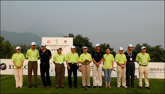 【golftime讯】8月16日早8点,2007别克中国高尔夫球俱乐部联赛中西分区赛开杆仪式在西安亚建高尔夫俱乐部10号发球台正式开始。中国高尔夫球协会顾问、原国家体育总局局长伍绍祖、陕西省高尔夫球协会副主席、原西安市市长、陕西省投资集团有限公司董事长冯煦初、国家体育总局小球运动管理中心副主任王立伟、国家体育总局小球运动管理中心经营管理部部长宋迎春、中体经纪管理有限公司董事总经理孙立平、陕西省高尔夫球协会副秘书长丁洁、上海通用汽车有限公司市场营销部别克高尔夫品牌经理李宇洁、西安亚建国际高尔夫俱乐部总经理、陕西省高尔夫球协会副秘书长韩继明等领导出席开杆仪式,并为中西分区赛开球。