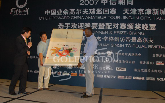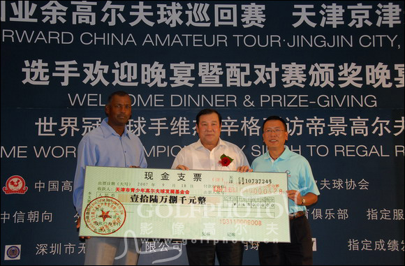 维杰·辛格(中)、张小宁(左)出席业巡赛天津京津新城站欢迎晚宴和配对赛颁奖活动。