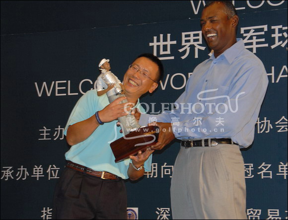 张小宁、维杰·辛格为配对赛冠军组颁奖。