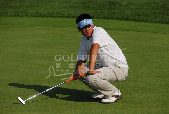 来自青岛的少年谢智首轮打出77杆,这是他在第18洞果岭准备推杆。