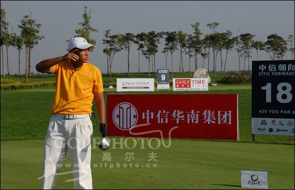 观澜湖英俊少年梅罗潇在第18洞担心开球后的落点。