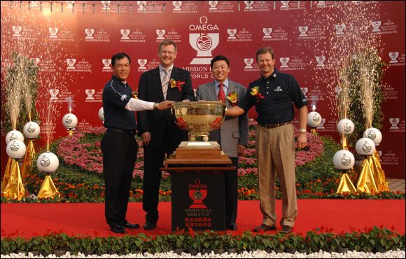 为庆祝世界杯重归中国观澜湖,观澜湖高尔夫球会主席朱树豪博士,欧米茄大中华区总裁卢克勤(Kevin Rollenhagen),在观澜湖共迎世界杯奖杯。庆典还邀请了高尔夫巨星古森、张连伟共同出席。