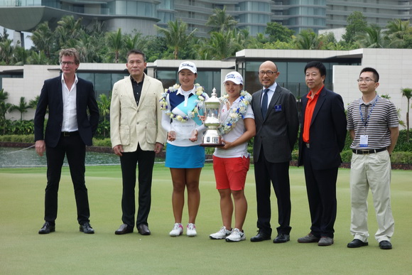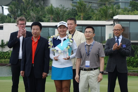 海南·绿城蓝湾小镇董事长高德雪与中高协副秘书长庞政为冠军金世煐颁发奖杯和花环。