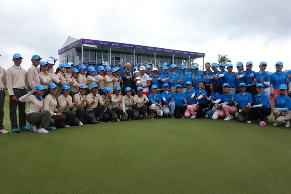 海南·绿城蓝湾小镇董事长高德雪、冠军金世煐与球场员工开心分享快乐时刻。
