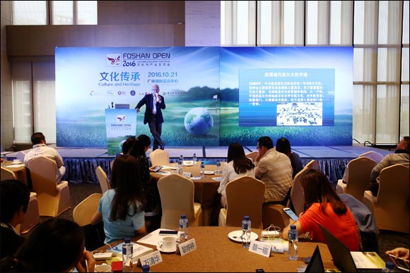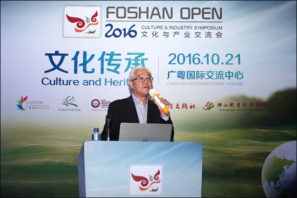 【golftime讯】10月21日,佛山公开赛的第二轮在风雨中进行。台风“海马”并未对比赛造成太大的影响。与往年相比,今年的赛事更有活力,在精彩比赛的同时,首届广佛高尔夫乐善健步行以及文化与产业交流会这两场活动也同期上演,并贯穿本届赛事始终。今天在广粤交流中心进行了一系列的活动。图为戴耀宗先生在讲话。