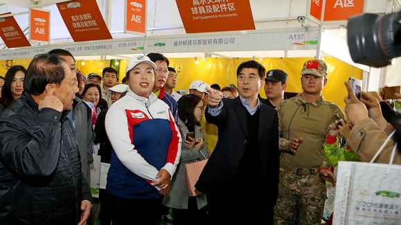 【golftime讯】 2016(第八届)塘厦高尔夫球博览会(下称高博会)24日在东莞市塘厦镇塘龙广场盛大开幕,2016年里约奥运会上为中国夺得唯一一枚高尔夫奖牌的广东女子高尔夫球员冯珊珊在紧张的比赛之余,莅临开幕式现场,为高博会助力。