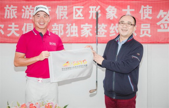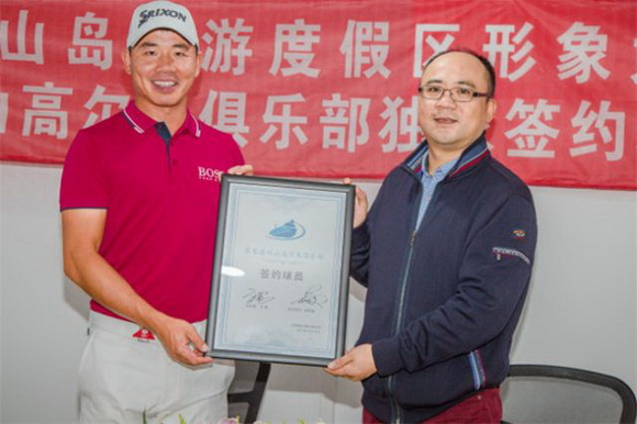 【golftime讯】10月25日下午于上海,张家港双山高尔夫俱乐部总经理方祺先生与两届欧巡赛冠军、中国顶尖高尔夫球手吴阿顺先生正式签署独家签约球员合作协议并颁发证书、交换合作礼物。
