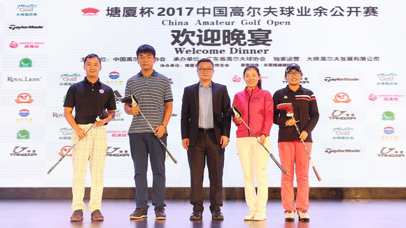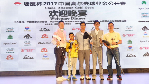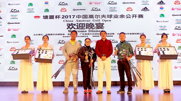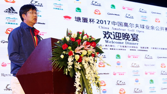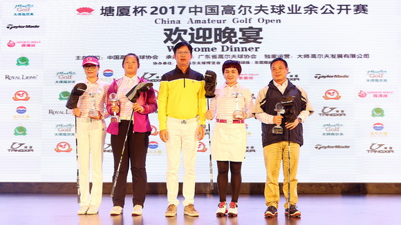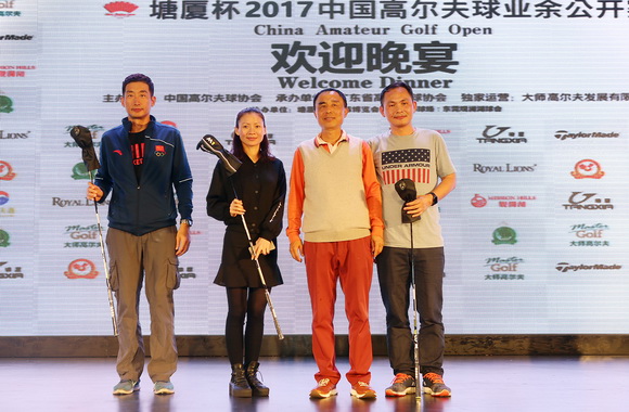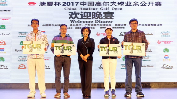 【golftime讯】11月19日,2017“塘厦杯”中国高尔夫球业余公开赛欢迎晚宴在东莞观澜湖圆满落幕。男子组比赛将于明日正式开打,女子组则将于周二开启首轮对决。国家体育总局小球运动管理中心奥运保障部副部长钟民;广东省高协副主席兼秘书长、广东省高尔夫球运动中心主任冯雄;广东省东莞市塘厦镇委委员许自福;湖南省高尔夫球协会副主席陈菁;大师高尔夫发展有限公司董事长赵延年;中国高尔夫球队队长、广东队队长梁文冲;观澜湖集团执行董事李佳琦;CCTV-5高网频道总监 单明;北京体育广播节目监制李轩;新华社体育部高级记者杨明;广东省高尔夫球协会副秘书长贾晓峰;广东省东莞市塘厦镇高尔夫产业发展办公室主刘裕兴、阿迪达斯大中华区公关活动及广告经理李缘;贵州茅台酒股份有限公司高尔夫酒、广东省粤西省区东莞城市经理董碧波;国瓷永丰源市场运营总监刘一和众多球员、媒体出席了今晚的活动。