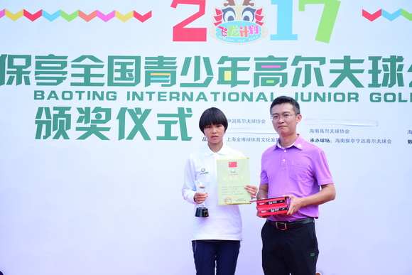 【golftime讯】2017保亭全国青少年高尔夫球公开赛,12月30日在保亭宁远高尔夫球会圆满落幕。经过三天的角逐,女子球员蔡丹琳本轮交出67杆(-5),以总杆204杆(71-66-67)夺下女子B组冠军;男子球员Hun Puiln决赛轮交出88杆(+16),以总成绩257杆(87-82-88)的一杆优势摘得男子A组桂冠。