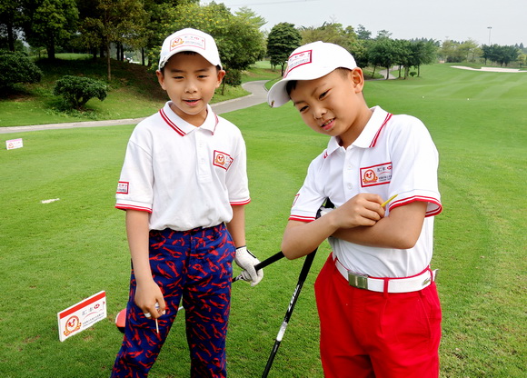 2015年汇丰青少年冠军赛广州站男子D组10岁半匡洋(右)赢了9岁周子勤5杆获得冠军。(摄影:阿沛)