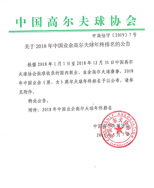 关于2018年中国男女业余高尔夫球员年终排名的公告