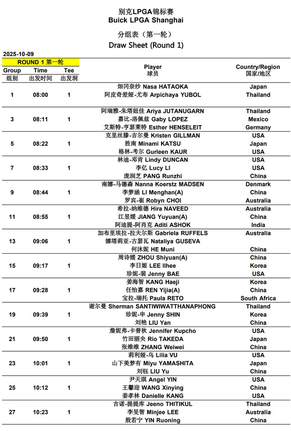 【golftime讯】2025别克LPGA锦标赛10月6-12日在上海旗忠高尔夫球会举行。本届赛事不设淘汰线,共有来自全球高尔夫82名女子顶流选手完整进行9-12日四轮比赛。以下为10月9日周四首轮分组表: