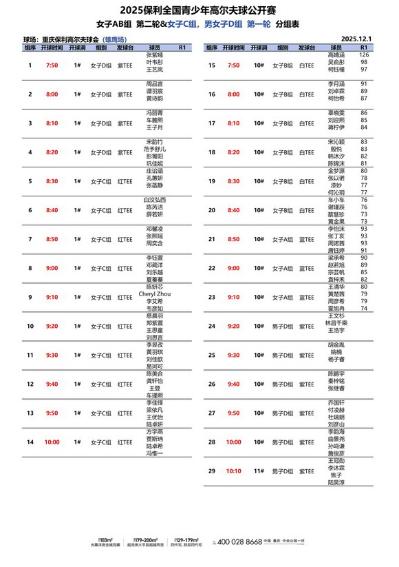 【golftime讯】11月30日,2025保利全国青少年高尔夫球公开赛AB组首轮比赛,在重庆保利球场晨雾与朝阳中开杆。经过一天的技巧、体力、意志综合比拼,男子A组李政达开局火热全程领先;刘泽宇三杆优势领跑男子B组;女子A组霍旭冉发挥稳定占据头名;女子B组黄金果和蔡慧珍携手位列榜首。