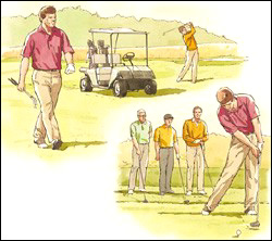 4. 找球要快 规则上说,在你宣布遗失球之前,你有5分钟时间去寻找。在竞赛期间,这样做没问题,但如果每个球员在每一球上都花费如此多的时间,这球根本没法打了。加快速度的方法是:第一,觉得有可能丢球时打一个暂定球;第二,减少寻找球的时间,最多三两分钟。 (《高尔夫》杂志) |